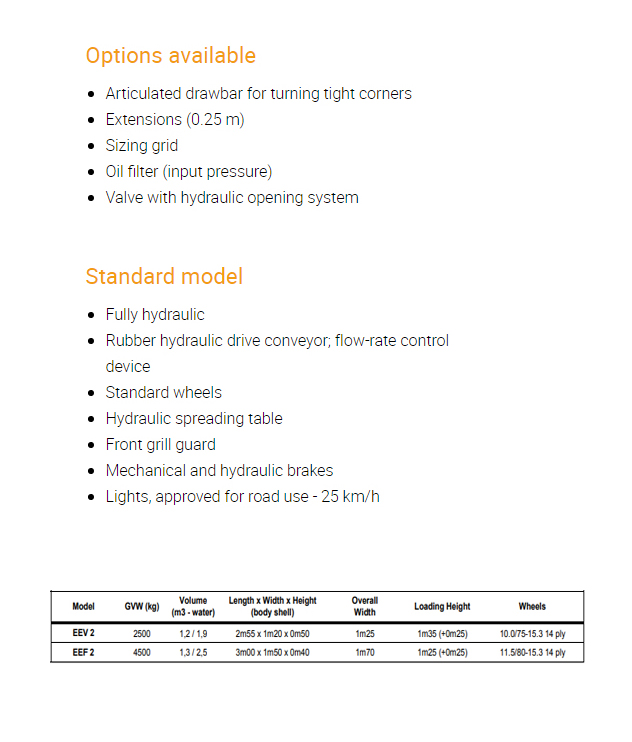 The equipment of this range is specially designed to spread calibrated materials as well as powders: manure, granules, pellets, lime ... A rubber conveyor at the base of the hopper carries materials thanks to its 2 discs. The baffles allow you to spread in a localized area or across the entire width.