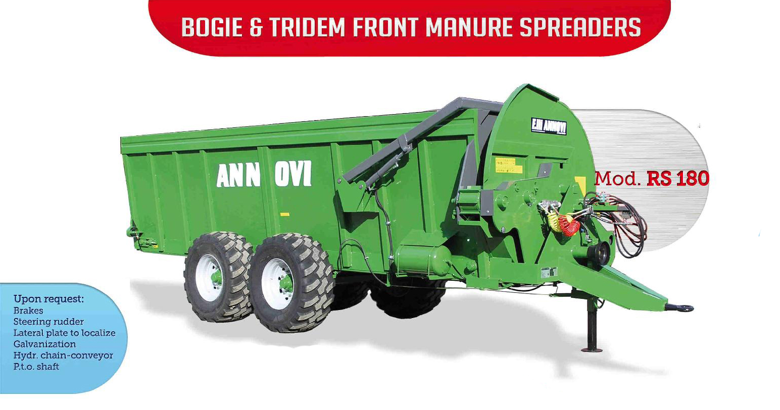 In the fertilization sector F.lli Annovi has a variety of manure spreaders (maximum capacity 23 cubic meters) suitable for use in open fields or large tracts of land. The turbine front expansion system improves tractor traction (the weight is distributed to the front of the trailer) and ensures lower fuel consumption given the limited power requirements compared to other models on the market. In this way, the strength of the mechanical system of the turbine is increased. The vase-shaped carton with external wheels suitable for high-diameter tires ensures high yields even on damp soils. Compatibility with various types of fertilizers (manure, compost, digested biogas, separated manure, vegetable waste) and the towed wheel rim (which maintains the same capacity), facilitate maneuverability and increase the versatility of F.LLI ANNOVI manure spreader .