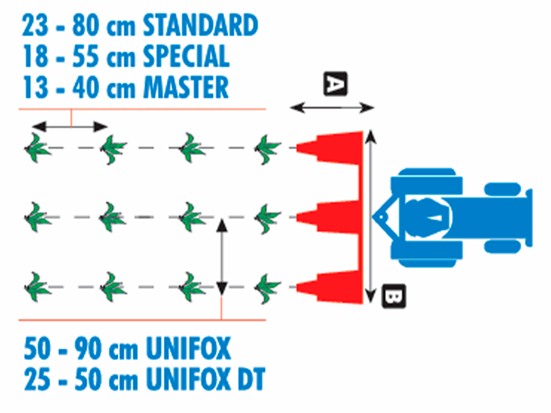 A) Standard distributor • 10 clamps, plant spacing 23–80 cm Optional: SPECIAL distributor with 15 clamps, plant spacing 18–55 cm Optional: MASTER distributor with 20 clamps, plant spacing 13–40 cm
