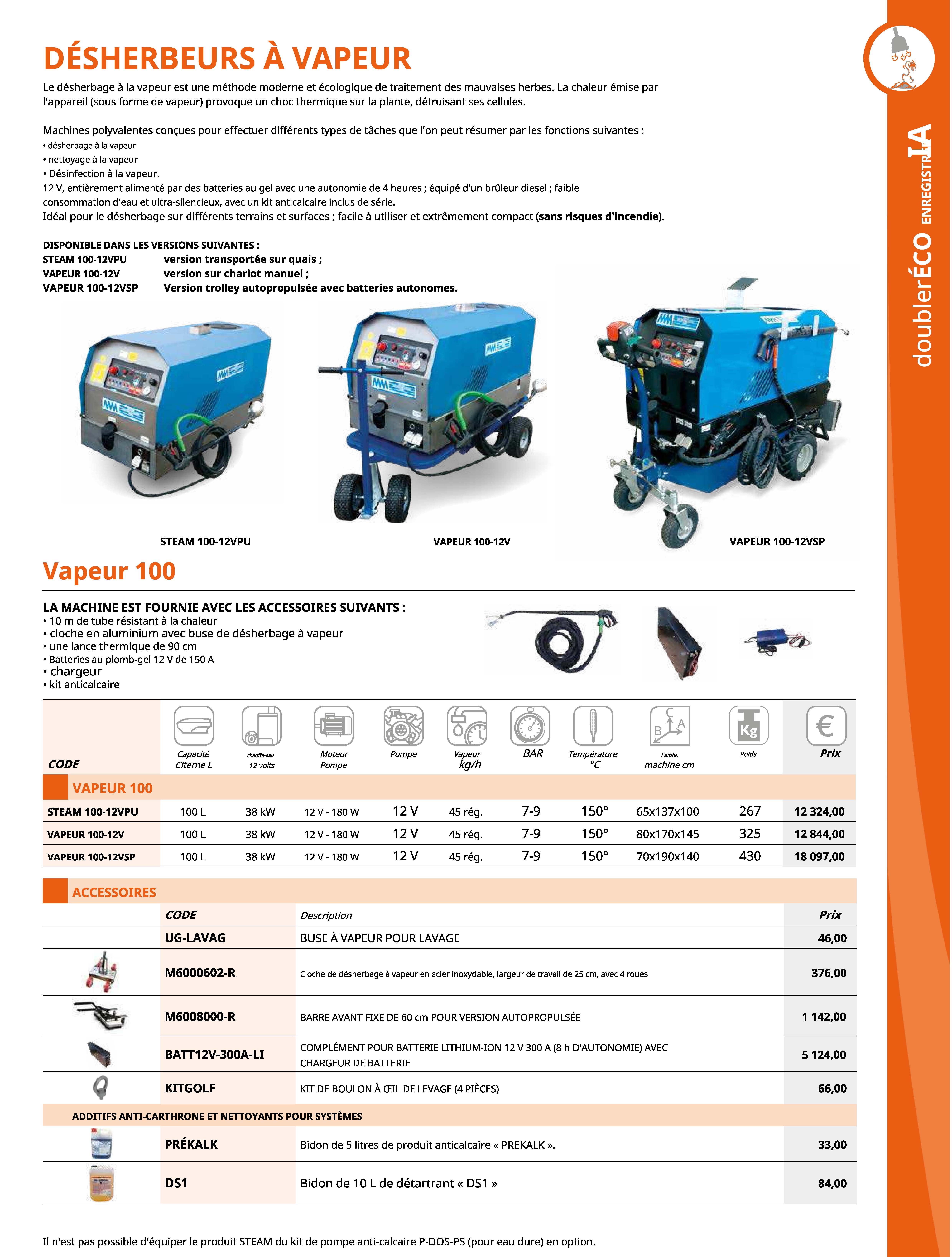 VAPEUR 100 transforme l'eau froide contenue dans le réservoir, l' envoyer à une chaudière à double bobinage. Un brûleur à mazout chauffe l'eau jusqu'à atteindre 140 ° C pour la fonction "Désherbage" - "désinfection". Il est l'action de la lance qui met en mouvement le brûleur qui chauffe l'eau au besoin.