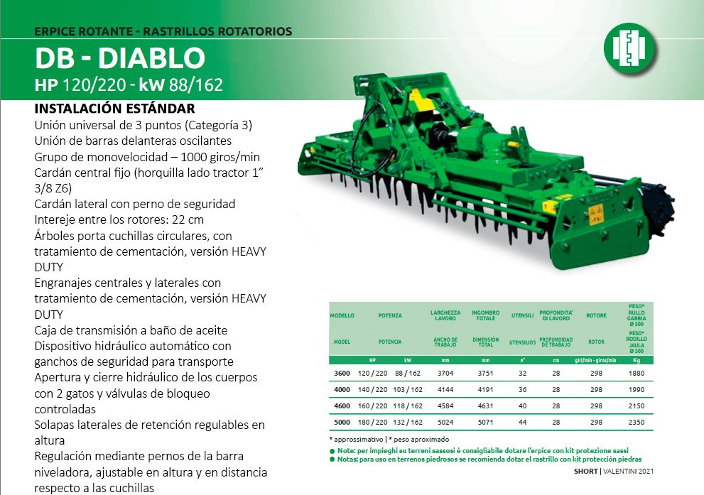 La VALENTINI DB DIABLO es una máquina creada para quienes viven de la tierra y exigen resultados constantes, profundos y profesionales. Esta grada rotativa no es solo un equipo agrícola: es una verdadera herramienta de transformación del suelo, capaz de aumentar la productividad, mejorar la estructura de la tierra y garantizar un acabado impecable incluso en las condiciones más exigentes. Su robustez, combinada con tecnología de alto rendimiento, la convierte en una referencia para agricultores profesionales, contratistas agrícolas y explotaciones de gran escala que necesitan fiabilidad absoluta y rendimiento diario.