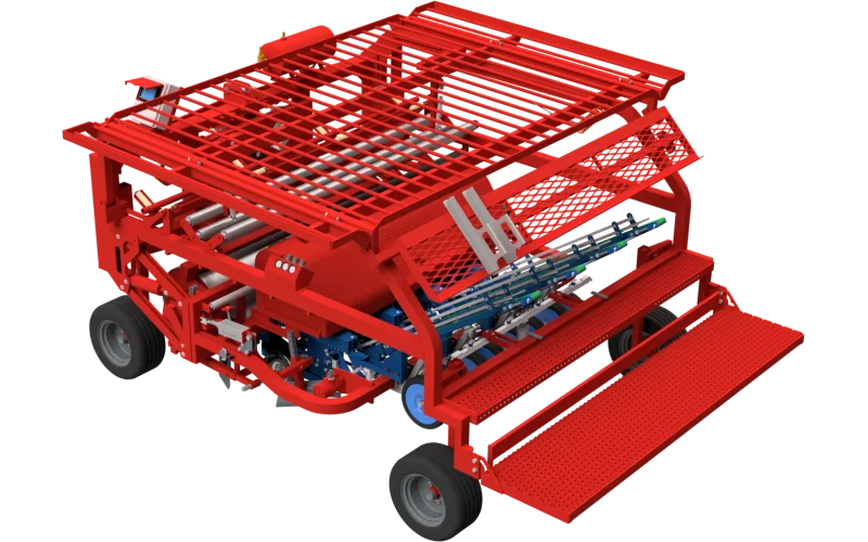 O Transplantador acolchoadora é capaz de estender o plástico filme tanto polietileno e biodegradável, fixa-la ao chão, perfura e transplanta plantas com turfa cúbica de modo semi-automático, com um rendimento médio de 5.000 plantas / hora por linha.